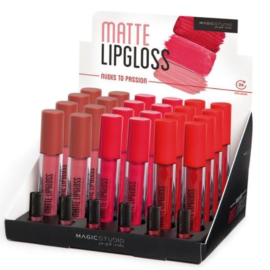 • Matte Lip Gloss lipstick; • Matte lipstick, vibrant color and strongly pigmented; • Resistant to water and transfer; • Set of 24 pieces with testers; • Available shades: Nude, Pink, Red • Country of import: Spain.